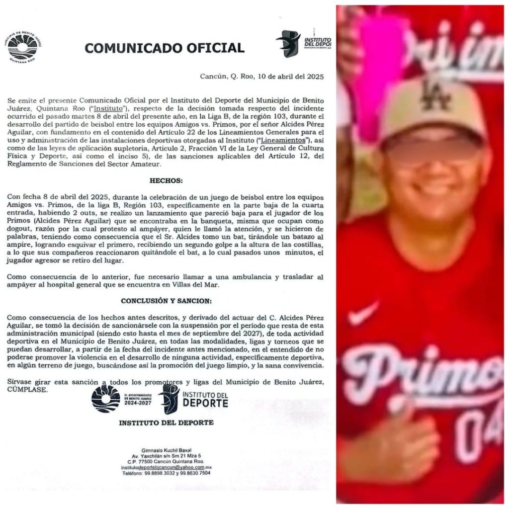 Los lamentables hechos que sacudieron a la comunidad deportiva concluyeron con una ejemplar sanción que entró en vigor contra Alcides “N” el cual estará vigente hasta el mes de septiembre del 2027 y en caso de extenderse se analizara la situación en tiempo en forma informó Jesús Chay Coordinador operativo del Instituto del Deporte Municipal.