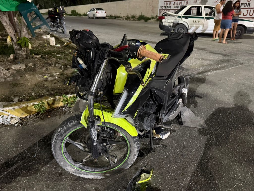 Según testigos la moto circulaba en carril preferencial y al parecer el taxi marcado con el número 1819 doblo a su izquierda sobre la avenida, Provocando la colisión en lado derecho de la cajuela.