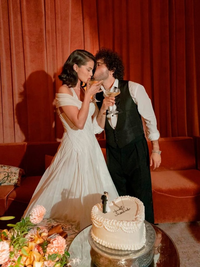 En otra foto, posan frente a un espejo dorado disfrutando de bebidas, en una escena relajada y divertida que muestra la complicidad que ha marcado su amistad. Taylor viste un delicado vestido color durazno con textura floral, mientras Selena, sentada con su vestido blanco de líneas simples, posa lanzándole un beso.