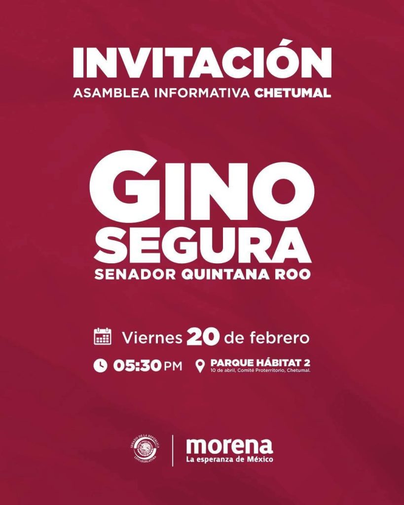 El Senador de la República por Quintana Roo, Eugenio «Gino» Segura Vázquez, extendió una invitación abierta a las y los habitantes de la capital del estado para participar en la Asamblea Informativa que se llevará a cabo el próximo viernes 20 de febrero.