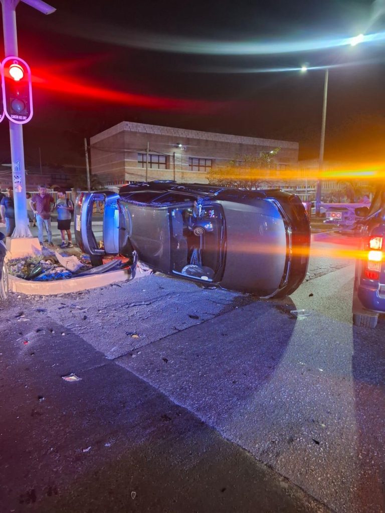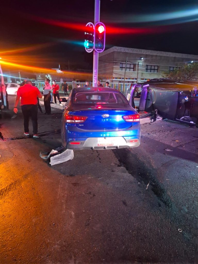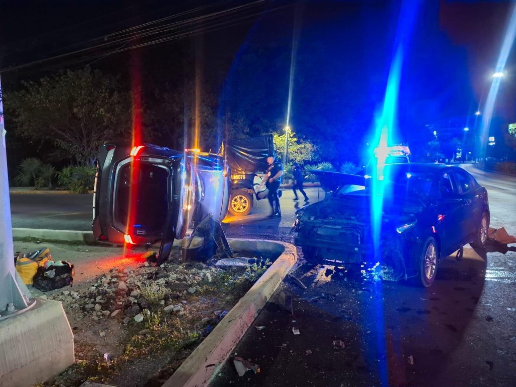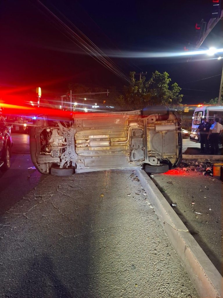 Un aparatoso accidente de tránsito se registró la madrugada de este domingo en el cruce de las avenidas Kabah con Nichupté, a la altura del colegio Da Vinci, dejando como saldo un vehículo volcado y cuantiosos daños materiales.